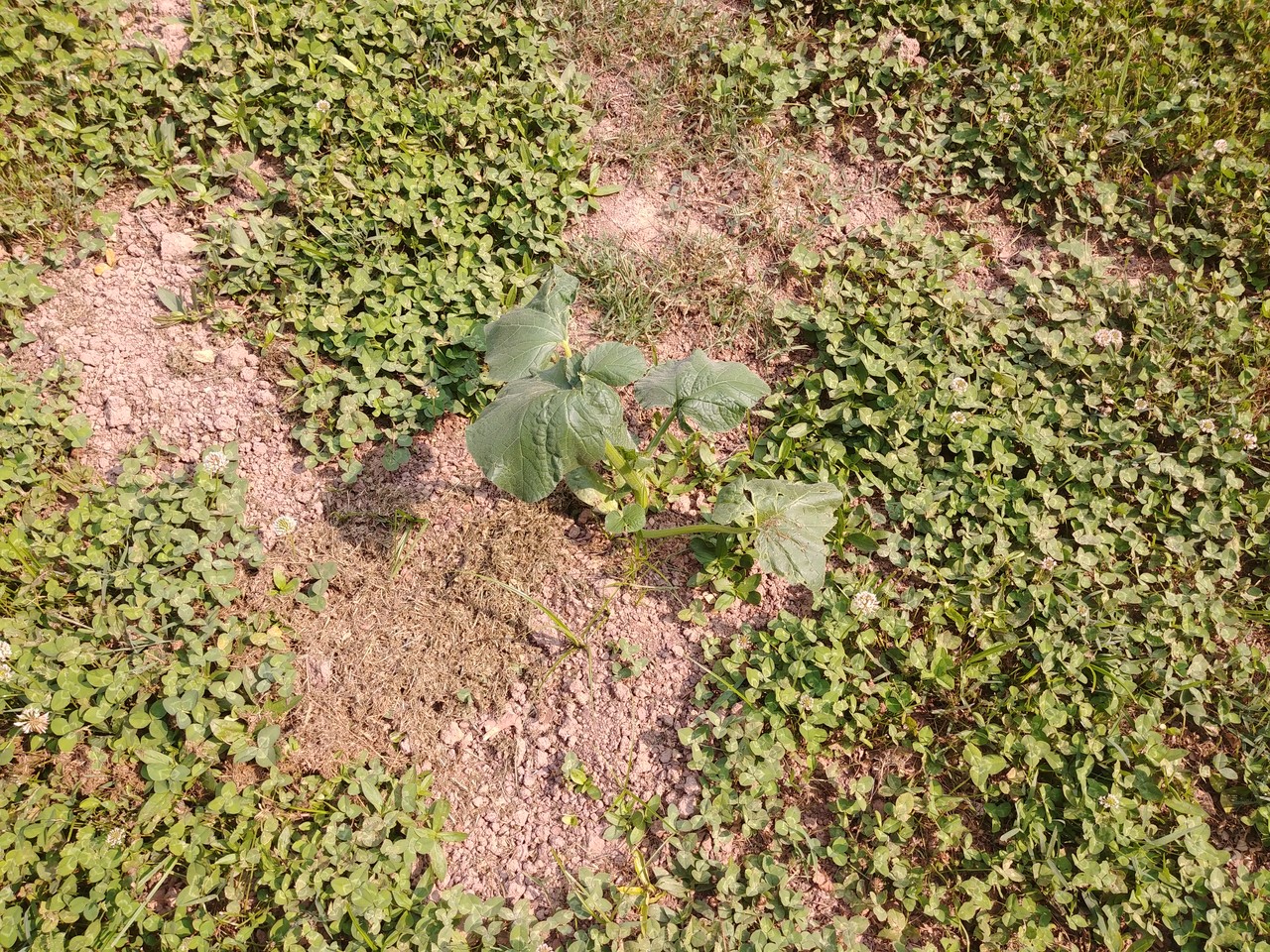 is a pumpkin plant growing in the dirt that I took from the former allium bed-cum-vole feeding trough and used to fill in low spots in the clover, decorative strawberries, parsley-piert, and who knows whatever else has taken over the lawn. In this case it's filling in a runnel from the overflow of one of the water barrels.
