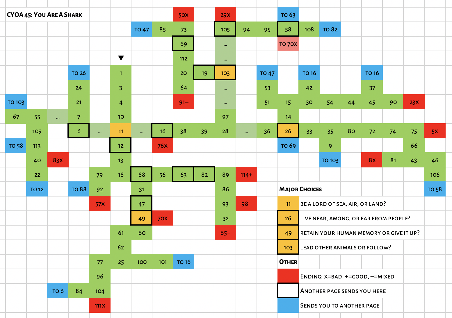 CYOA 45: You Are A Shark (1985)You enter a temple where you find yourself trapped by a chimeric idol. A seated monk leads you through meditations in which you experience many lives as different animals. (Or maybe just one, depending on your choices.) The not-subtle subtext is that humans are jerks.