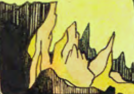 With the immediate threat quelled, the driver pointed toward two potential routes leading to their destination, marked by ominous reddish mountains and peculiar yellow spiky formations. Alas, the Stilt Loper could not traverse the red mountains, thus the party chose the yellow path, setting off under favorable conditions with a gentle tailwind to buoy their spirits. As they approached the yellow cliffs, they beheld eerie carvings of grim-faced figures, forever etched into the stone, whispering tales of yore.