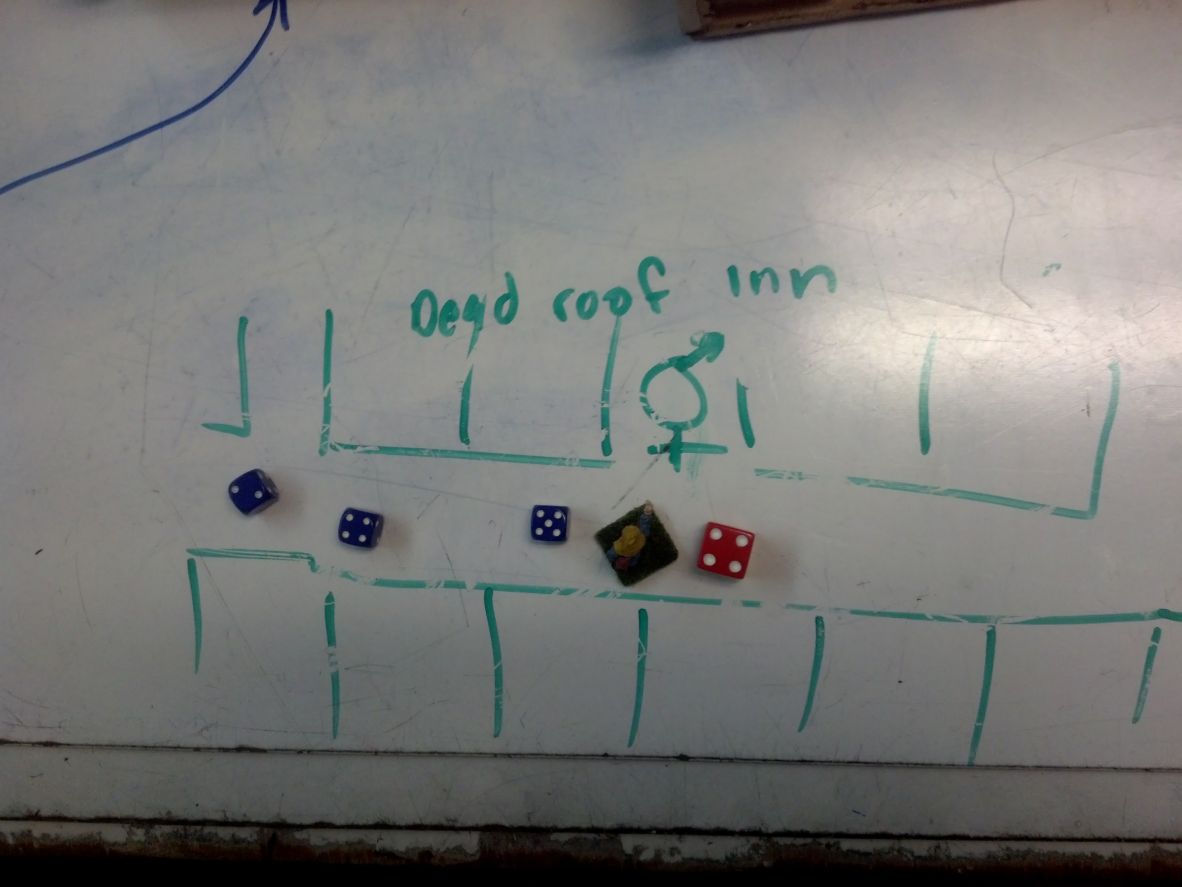Elefus, Slade and the town constable were in the church's bell tower. Numrendir, Huang & Honda, and eighty percent of the ship's crew were at the Dead Roof Inn. Twitch & Kmaregh and twenty percent of the crew were aboard ship and not affected by the battle. (Twitch had not been there awhile so I had to judge he had been below deck aboard ship for the past several gaming sessions.)