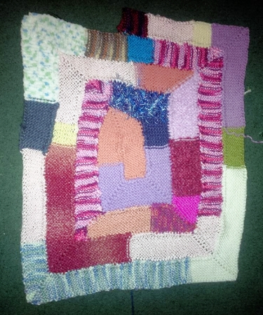 Besides the froggy basket I've been working steadily on my 10-stitch blanket, trying to work the ends in as I go. I went to a wedding recently and it involved enough of a car trip for me to almost run out of scrap yarn for the blanket.