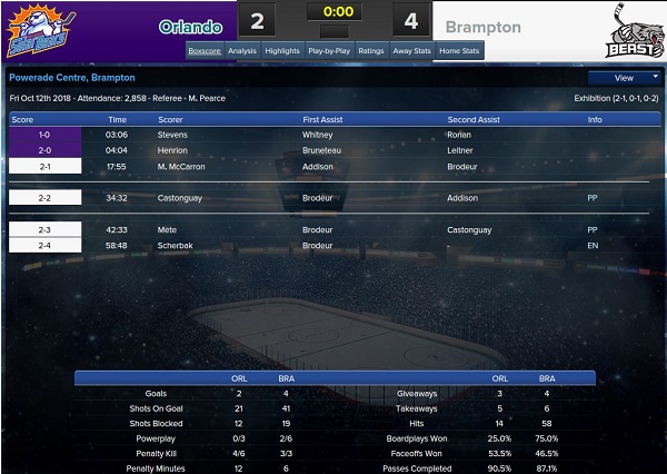 Orlando scored the first two goals; half of Brampton's goals were on the powerplay; Brodeur had 4 assists; Ouellet had just over 25 minutes; Addison and Valcourt were absolutely exhausted by the end; Scherbak and Baker looking a little winded.