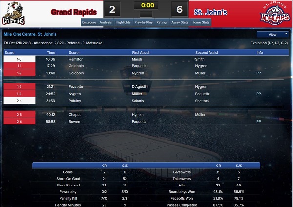Nygren had a goal and 3 assists; Paquette had 3 assists; IceCaps has 3 powerplay goals; Hudon got heated with Smith and they dropped the gloves - Hudon started off well but Smith ended it; Juulsen played just over 29 minutes; Danault and Goldobin had more than 20 minutes; Goldobin looked tired by the end.
